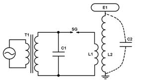 Простейшая схема катушки тесла изображена на Рис. 1 Питание схемы происходит от источника переменного тока, например, от бытовой электрической сети 220В 50 Гц. После повышения напряжения трансформатором T1, ток поступает на конденсатор C1. По мере заряда конденсатора напряжение на его обкладках в какой-то момент достигает величины при которой происходит пробой искрового промежутка разрядника SG. Напряжение пробоя зависит от расстояния между электродами разрядника. При этом сопротивление разрядника уменьшается до очень маленькой величины и происходит фактически формирование первичного резонансного контура C1L1. Ток из конденсатора перетекает через катушку на противоположную обмотку и затем тут же перетекает обратно. Возникает генерация высокочастотных колебаний на частоте резонанса контура.