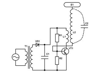 Схема работает по принципу транзисторного усилителя с положительной обратной связью, что в свою очередь переводит схему в разряд генераторов. Так-как в качестве нагрузки транзистора VT1 и элемента обратной связи выступают первичная и вторичная обмотки, то работа генератора происходит на результирующей резонансной частоте этих двух связанных колебательных контуров. Транзистор работает в режиме A, который определяется напряжением смещения базы транзистора. Напряжение смещения в свою очередь задается с помощью резисторов R1 и R2.